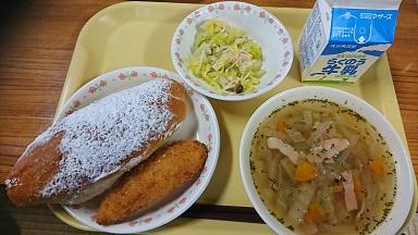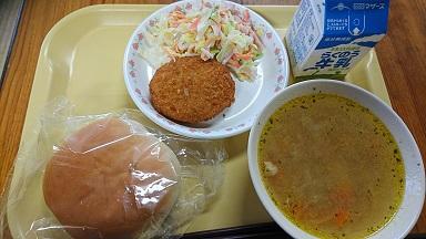 「丸パン、牛乳、牛肉コロッケ、マヨネーズサラダ、オニオンスープ」でした。