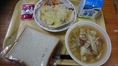 「食パン、マーシャル、牛乳、人参サラダ、ほうれん草のグラタン、うずら豆とマッシュルームのスープ」でした。