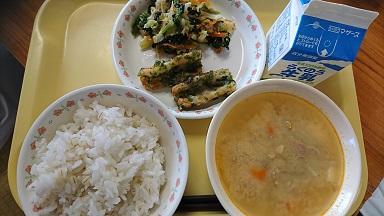 「麦ごはん、牛乳、ちくわの磯辺揚げ、ほうれん草のおかかあえ、ピリ辛豚汁」でした。