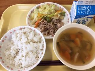 今日の給食は「麦ごはん、豚肉のしょうが焼き、野菜炒め、根菜汁」でした。