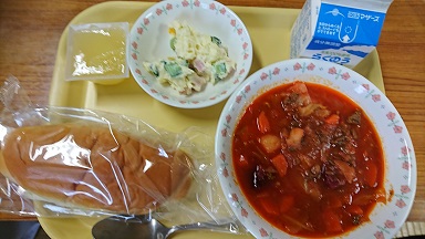 「ミルクパン、牛乳、マセドアンサラダ、ボルシチ、りんごゼリー」