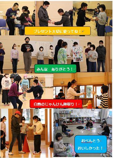 送別行事では、プレゼント交換やレクリエーションなど楽しい時間を過ごしました。たくさんのプレゼントをもらいとても嬉しそうな6年生。レクリエーションでは、白熱した戦いを楽しむ姿が見られました。