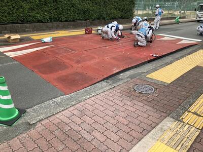 本校正門前に可搬式ハンプ(スムーズ横断歩道)が設置されました。これは車側からすれば段差のある横断歩道で、設置により自動車の走行速度の軽減がどの程度図れるかという実証実験のための仮設のものです。11月16日(火)までの約1カ月間設置されます。