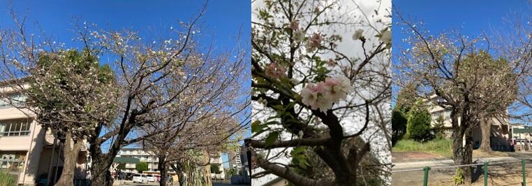 さて、グラウンド横のプロムナードには桜の木が数本並んでいますが、そのうちの1本だけが、季節を間違えたのか2分先程度に花を咲かせています。花びらをよく観察すると、ピンクと白の花が入り混じっています。グラウンドに出るとき、ちょっと視線を上にやってみてください。