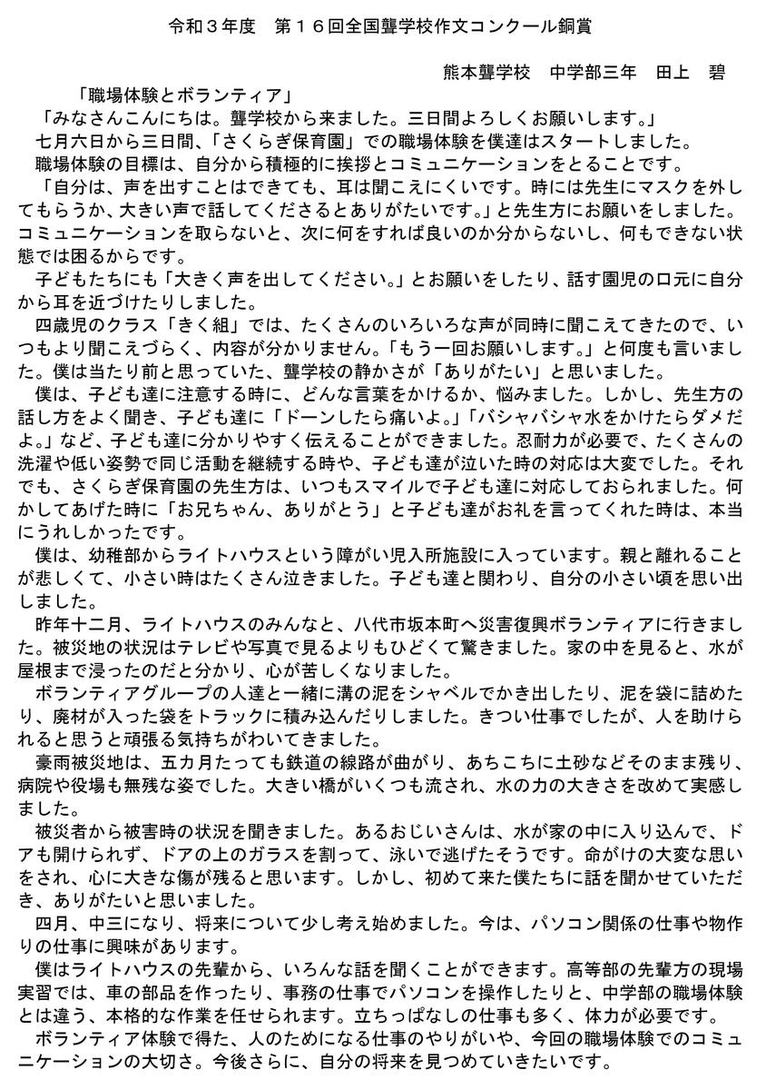 日頃の何気ない日常の一端を表現した作文もあれば、聴者家族の中に一人だけ聞こえない自分がいることへの不満・葛藤、そしてそれを乗り越えた先の家族への感謝の気持ちを表現した作文等々、文の長い短いはありますが、どの子も心の声を素直に言葉で表現しています。どの作文も子供たちの心の豊かさ、言葉の温かさが私の心に染み入りました。