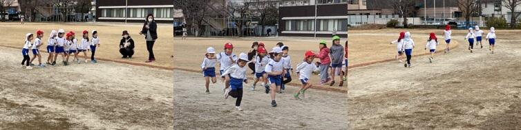 「かけっこ」では、強い競争意識はまだまだ芽生えてはいないようですが、どの子もゴール目指し、途中立ち止まることなく走り抜けていきました。