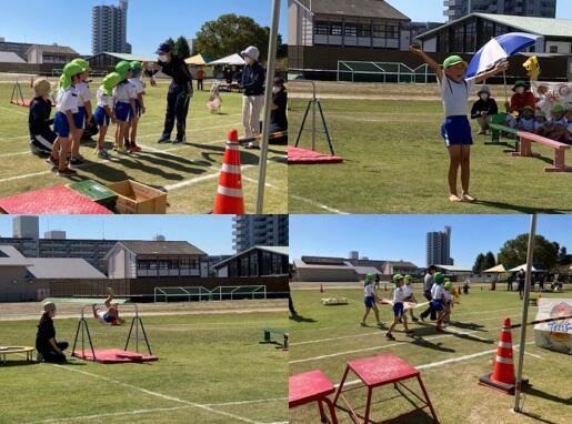 一年ぶりの運動会を迎えた青組(4歳児)、緑組(5歳児)の子供たちは、「かけっこ」の他、「むしさんの玉入れ」(青組)、「くまろう2021みどりんぴっく」(緑組)に出場しました。「むしさんの玉入れ」では、可愛らしいちょうちょ、カマキリに変身した8人がダンスをした後に、玉入れかごに向かって投げ方を工夫したり、友だちと協力したりする場面を見ることができました。また、東京オリンピック・パラリンピックが開催された年にちなみ、緑組の子供たちは「くまろう2021みどりんぴっく」で一人ひとりが得意な種目に挑戦し、それぞれに輝いている場面を見せてくれました。