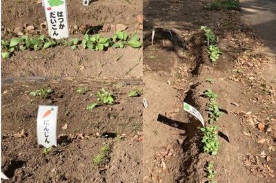 中高等部校舎前の畑では、小学部の子供たちが植えた「はつか大根」や「人参」、その他諸々の野菜の種が芽を出し、葉を広げ始めています。