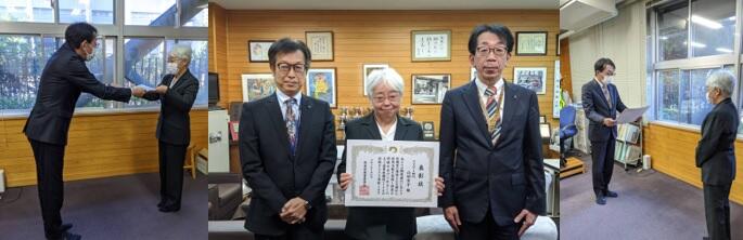 写真は熊聾校長室にて県特別支援教育課長の牛野様から表彰状を受けられた時の様子です。