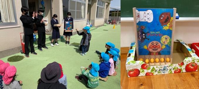 3月22日(火)、高等部1年生が家庭科の授業で製作したおもちゃ(2種類)を幼稚部の子供たちにプレゼントしてくれました。
