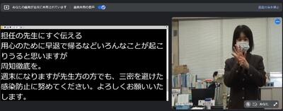 近日中に「まん延防止重点措置」が適用される見込みであり、本校では各学部行事や会議、研修等の開催方法の見直しを進めているところです。やむを得ず、急な変更等を迫られるかと思いますが、どうか御理解と御協力のほどよろしくお願いいたします。