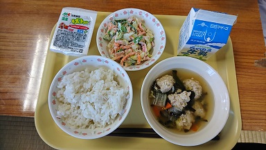 「麦ごはん、牛乳、とり団子とキャベツのスープ、納豆、ゴマネーズあえ」