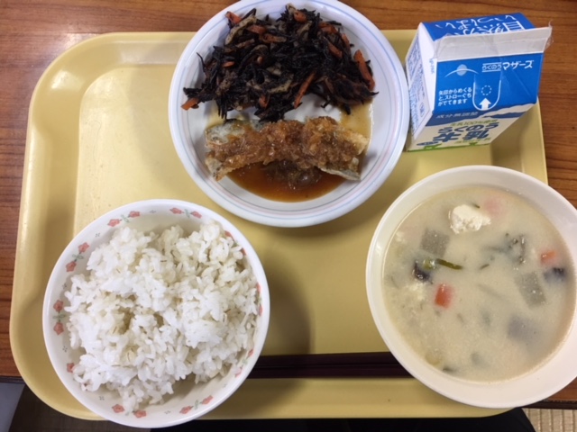 麦ごはん 牛乳 みそけんちん汁 太刀魚の香味だれ ひじきの炒め煮でした。