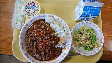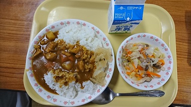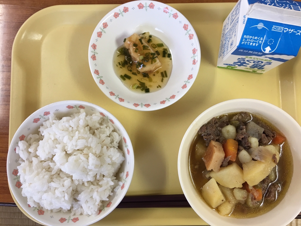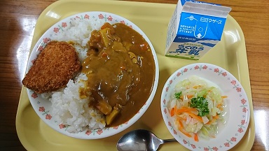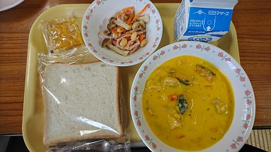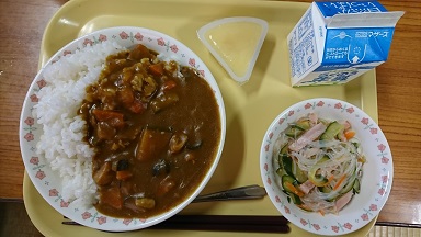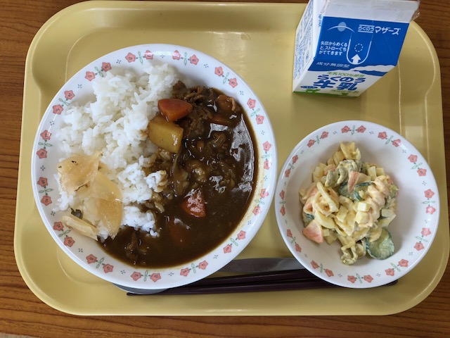 ポークカレーライス、牛乳、ふくじんづけ、マカロニサラダでした。