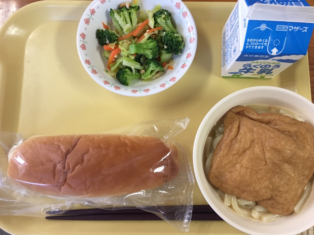 ミルクパン 牛乳 きつねうどん ブロッコリーのナッツあえでした。