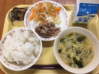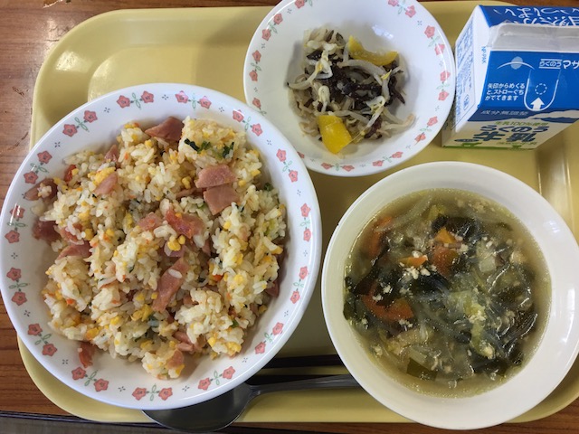 今日の給食は、焼豚チャーハン、はるさめスープ、もやしときくらげの和え物でした!