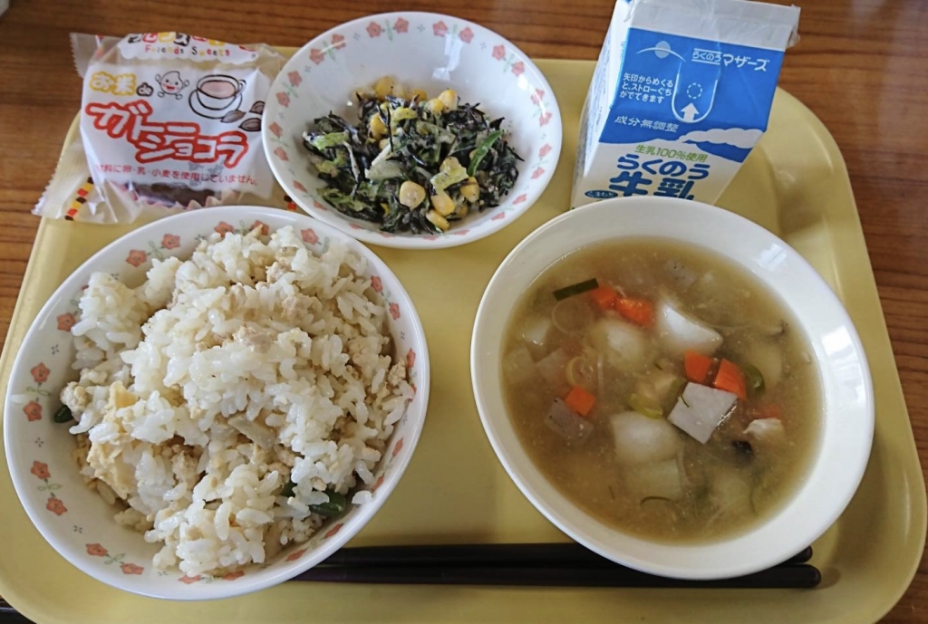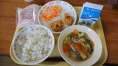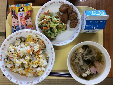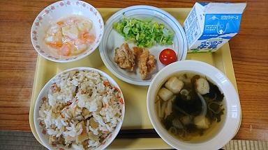 「たけのこごはん、牛乳、おふの吸い物、鶏肉のからあげ、せんキャベツ、ミニトマト、フルーツヨーグルト」