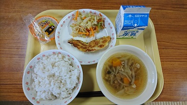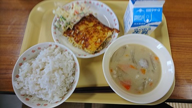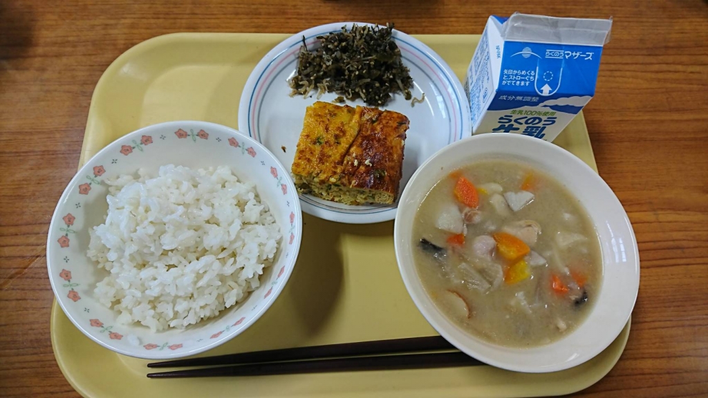 麦ごはん、牛乳、だご汁(しょうゆ)、千草焼き、手作り高菜ふりかけでした。