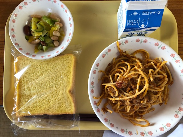 米粉いりかぼちゃパン スパゲティミートソース、ビーンズサラダでした。