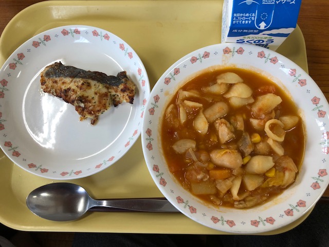 ココアパン、牛乳、トマト鍋、魚のマヨマスタード焼きでした。