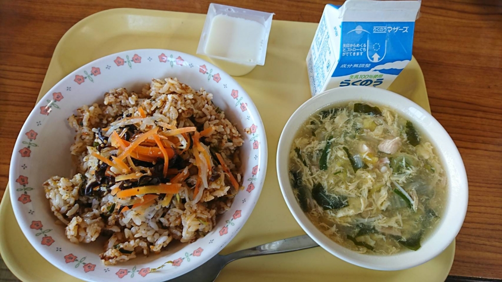 「炊き込みごはん、牛乳、あじの南蛮づけ、もずくスープ」