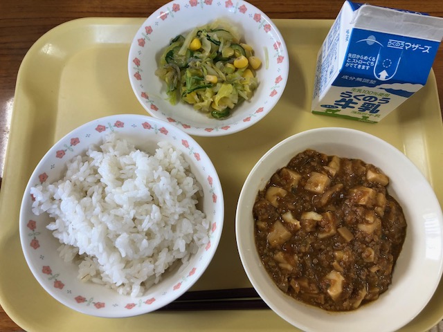 麦ごはん、牛乳、マーボー豆腐、しらすサラダでした。