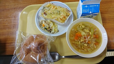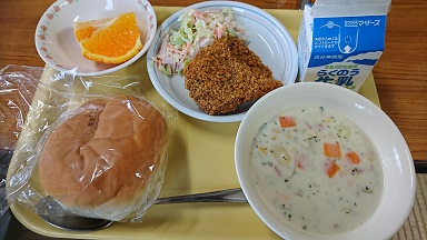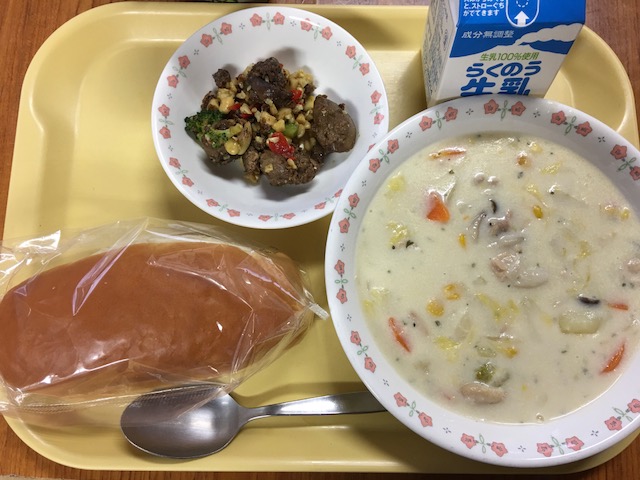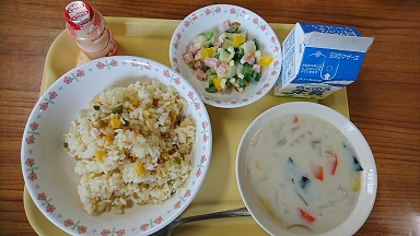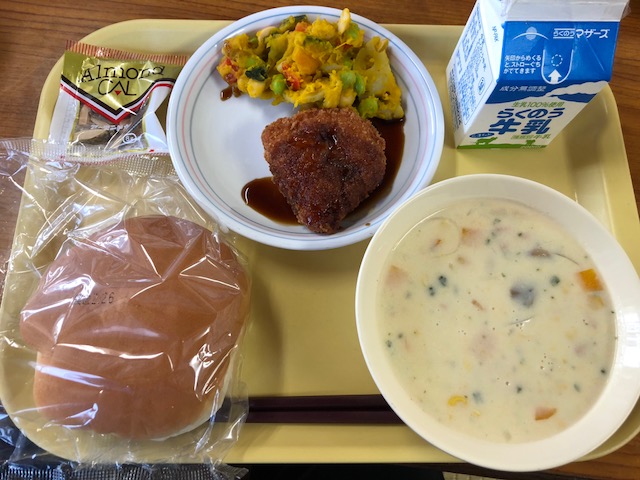 「コーンピラフ、牛乳、スープシチュー、マセドアンサラダ、ヤクルト」