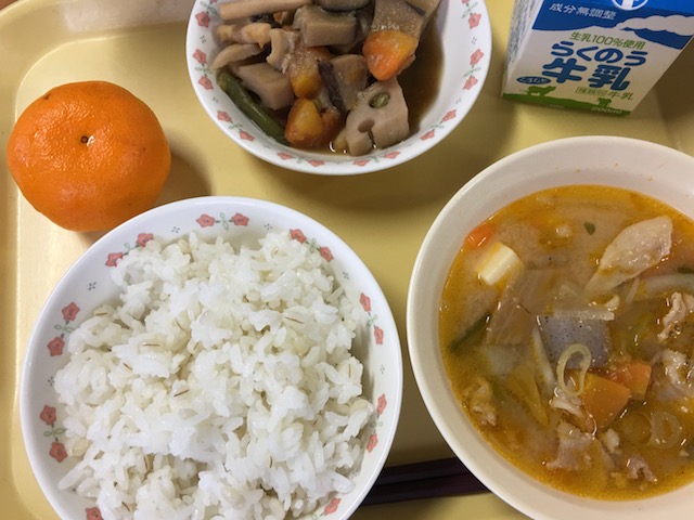 麦ごはん、牛乳、ピリ辛豚汁、いかと里芋の煮物、ぽんかんでした!