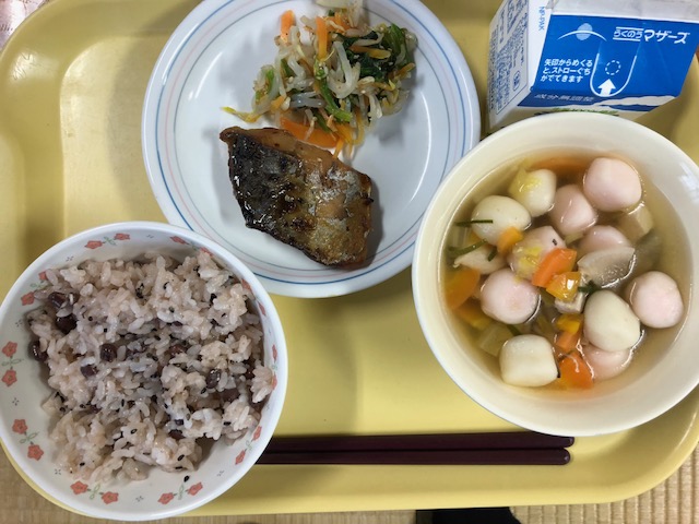 赤飯、紅白はんぺん汁、さわらの西京焼き、ごま和え、お祝いデザートでした!