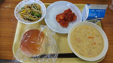 「麦ごはん、牛乳、酢豚、中華風サラダ、ワンタンスープ」