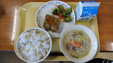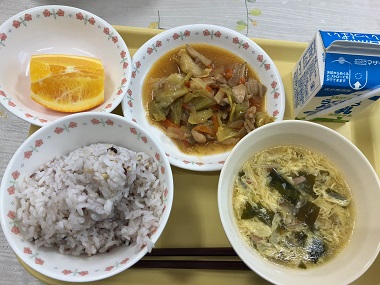 「麦ごはん、牛乳、魚のひすい焼き、ごま酢あえ、豚肉と野菜のスープ、みかんゼリー」