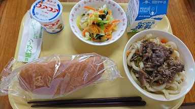 「セルフおにぎり、牛乳、肉うどん、磯あえ」
