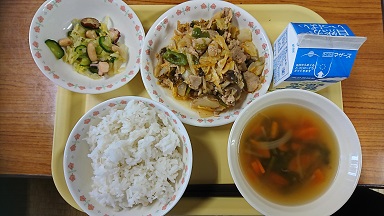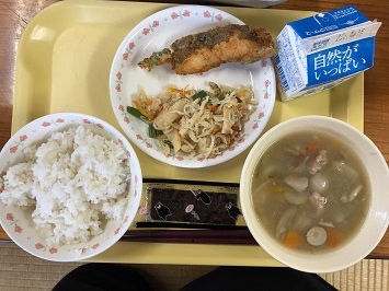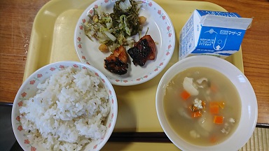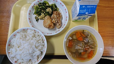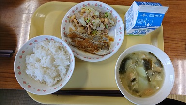 「麦ごはん、牛乳、塩から揚げ、青菜炒め、ベーコン汁」