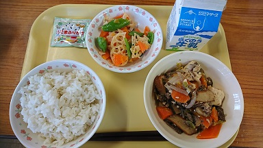 こぎつねごはん、牛乳、のっぺい汁、ひじきサラダ、チョコケーキでした。