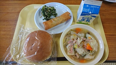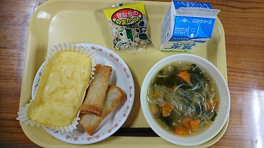 「チーズ蒸しパン、牛乳、春巻き、具だくさん中華スープ、うまかってん」