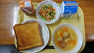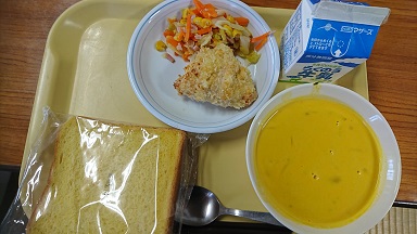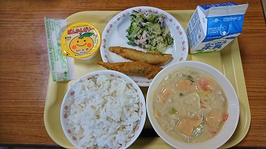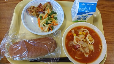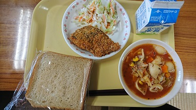「黒糖パン、牛乳、あじフライ、マヨネーズあえ、ミネストローネ」