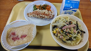 「手作りいちご蒸しパン、牛乳、塩ラーメン、ちくわサラダ天、海藻サラダ」