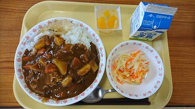 「カレーライス、牛乳、福神漬け、コールスローサラダ、みかんゼリー」