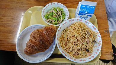 「キャラメルクロワッサン、牛乳、野菜とたらこのスパゲティ、そらまめサラダ」