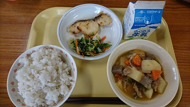 「麦ごはん、牛乳、魚の西京焼き、新じゃがと厚揚げの煮物、春キャベツのごまあえ」