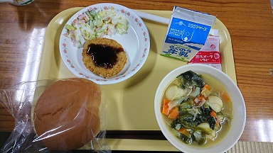 セルフバーガー、牛乳、コーンスープ、ソースカツ、温野菜のサラダでした!