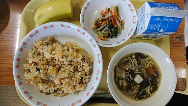「キムチチャーハン、牛乳、もずくスープ、ほうれん草のナムル、バナナ」