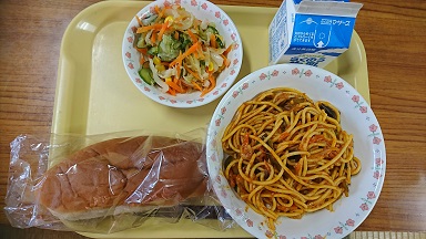 「ミルクパン、牛乳、夏野菜ナポリタン、さらタマサラダ」