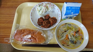 「ミルクパン、牛乳、タイピーエン、手作り肉団子のケチャップあえ、ポテトサラダ」
