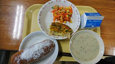 「手作りクリームパン、牛乳、いんげんのごまあえ、ふわふわスープ」