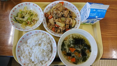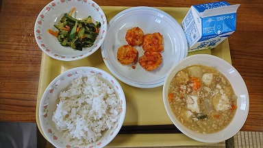 「麦ごはん、牛乳、厚揚げの中華煮、エビチリ、きゅうりとわかめの中華あえ」