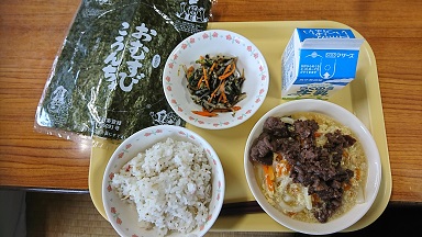 「ビビンバ、牛乳、もやしのナムル、わかめと卵のスープ」