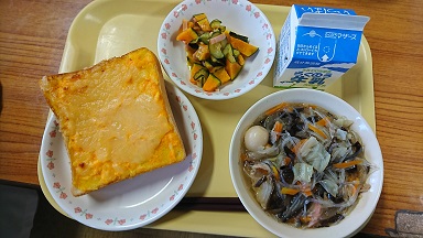 「マヨチーズトースト、牛乳、かぼちゃサラダ、タイピーエン」