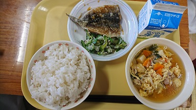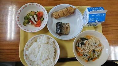 「ごはん、牛乳、サバの煮つけ、イカとトマトの和えもの、にゅうめん、きなこもち」
