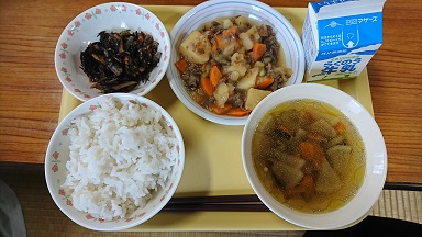 「麦ごはん、牛乳、肉じゃが、ひじき炒め、さわにわん」
